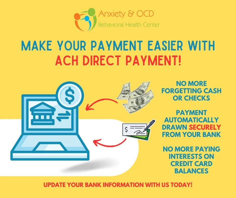 Preferred method: ACH Direct Payment (secure, automatic). We take ACH rather than cash or checks.